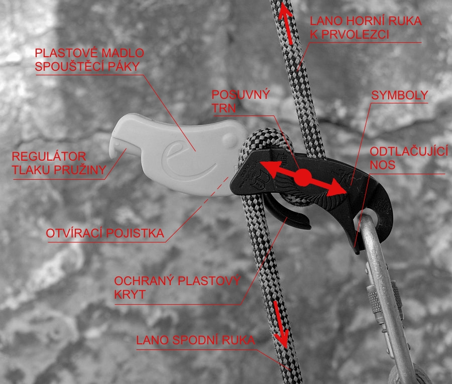 Pokud mluvíme o podávání lana je třeba zmínit ještě jednu funkci. A sice je zde možnost nastavit dvě úrovně síly, která  zajišťuje odtlak čepu. V praxi je to nepříliš zřejmé, ale pokud jste zvyklí rychle podávat a nemáte fungl nové lano, budete pravděpodobněji pracovat právě se stalčeným čepem. Jistítko blokuje při pádu stále spolehlivě a lano přitom lépe běží skrz.