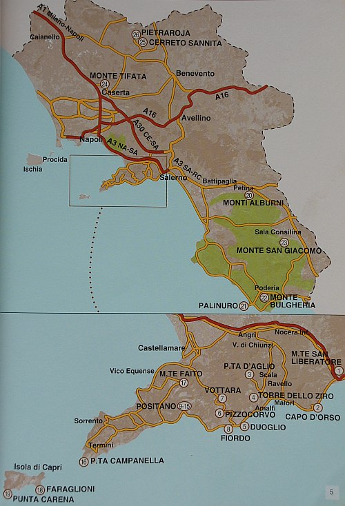 Oblasti se nacházejí ponejvíce na pobřeží tohoto poloostrova, ale najdete zde i nějaké ty vnitrozemsky situované skály. Dále je do průvodce zařazeno pár oblastí na severu a i jihu provincie Campania.