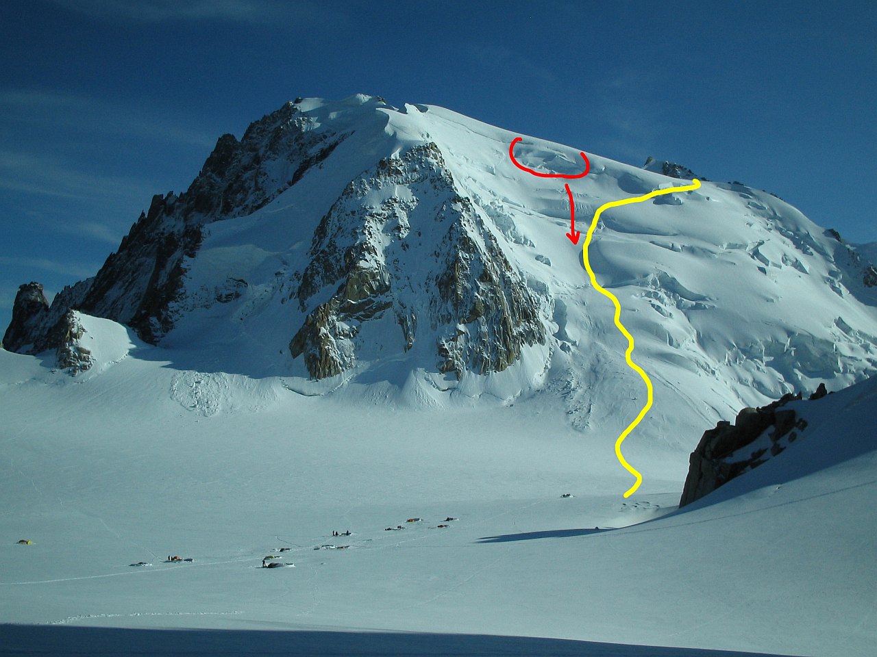 V dnešní době se dají očekávat další obdobné sesuvy i na jiných místech Alp. Podobný sesuv jsme například zaznamenali i na Normálce na Allalinhornu ve Wallisských Alpách. Před tím jsme tímto místem šli v pohodě ale je pravda, že jsme opět krapet přidali do kroku … a pak po čtyřech dnech jsme se tu setkali opravdu s mohutným sesuvem ledových ker tak dva dny starým. Takový sesuv se prostě nedá přežít (viz foto, na fotografii je naznačena i původní sestupová trasa, kterou se chodilo tak před měsícem).