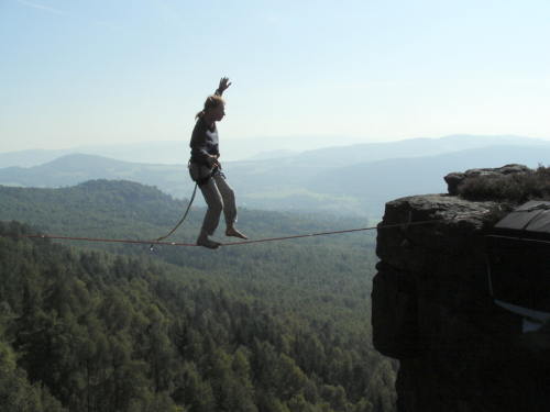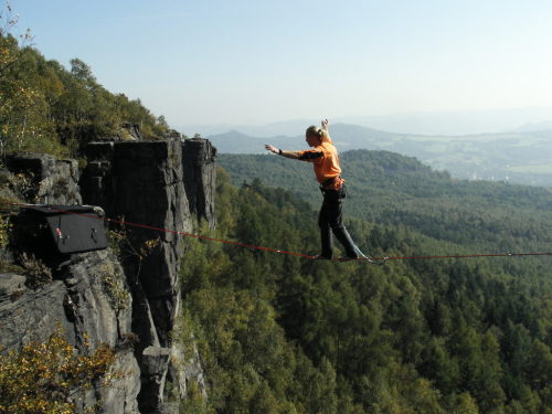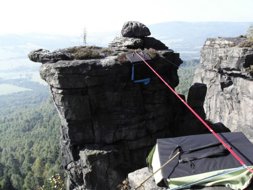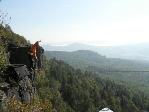 27. a 28.9. jsme natáhli highline z masívu na Rajskou věž na Modříně u Tisé. V sobotu kratší verzi zhruba 5-metrovou, v neděli o trochu delší asi 9-metrovou.