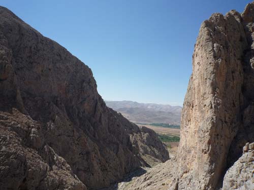 Nalevo udolí Cimbar Vadisi, uprostřed chata Ordosu a v pozadí nejvyšší vrchol Dermikazik 3800m.n.m