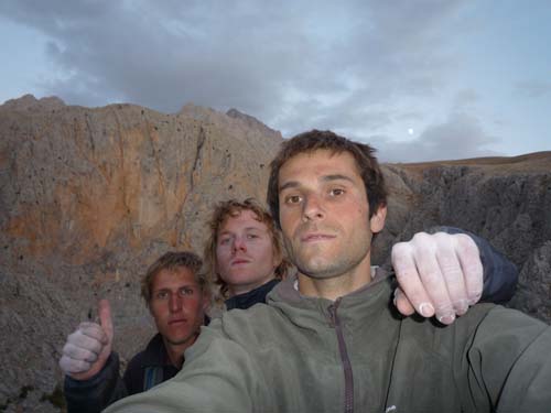 Na různá nesmyslná omezení už jsme zvyklí, tak jako v Adru borháky ne, že tam byly vždycky kruhy. Tak to nám zas moc nevadí, když se jim tam líbí okruhované stěny, dáváme kruhy, hlavně že můžem lézt nové směry, ale bez nýtů ty velké stěny? To je fakt skoro nemožný. Naštěstí nám zdejší horolezec nabídl alternativu, a to údolí Cimbar Vadisi, kde prý mají taky stěny až 650 metrů vysoké, a můžeme si tam prý boltovat jak chceme, stačí, že odspodu.