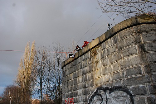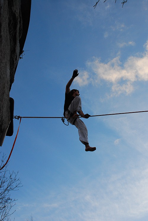 Určitě to není nic lehkého já bych to nedokázal, ale jsem trochu zklamán já si celou dobu myslel, že se chodí po kulatém laně a ne plocháči. Podobně jsem byl zklamán když jsem se po letech dozvěděl, že někteří klasici v Českém krasu některé cesty napřed očistili ze slanění a potom je lezli od spodu a těmto cestám potom říkali prvovýstupy.