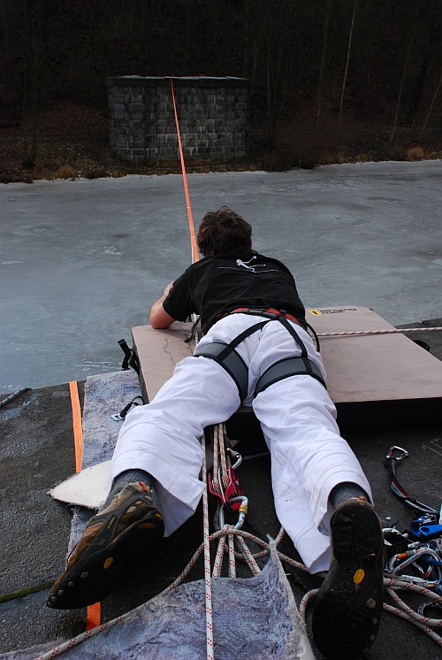 Když člověk spadne uprostřed, tak by tam byly ještě tak 2 metry rezerva. Ale led nás znepokojoval, to je pravda :) Ale zase to je lepší, než tekoucí voda. PS: V Hradišti už je wasserline pokořená.