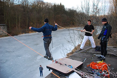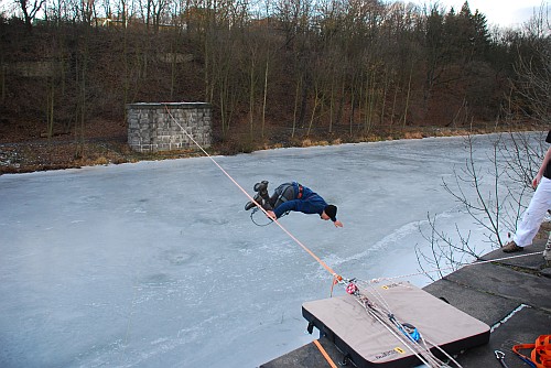 Cau. To mi taky napadlo. Kdyby praskla lajna, tak clovek de urcite na zem/led. Doufal sem, ze se to nastane a kdyz, tak bude uz dost zbrzden lajnou, ktera neco pochytila pred tim, nez praskla. Jinak v lete tam je tak metr a pak bahno, takze jistici lano aspon chodce vytahne z bahna. Utopit se zarazenej po prsa v bahne bych nechtel.