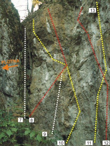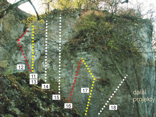 4. Sto roků samoty, 7+/8- - J. Mrnuštík a M. Jedlička, 2008Krásné plotnové lezení, možná lehčí jak udávaná klasifikace (viz diskuze k cestě zde na Lezci). Kluci tuhle cestu doslova vyrvali mechu. Nástup dole z jeskyně bez odšlapu. Cesta vede přes 4 bh k erární smyčce a od ní vpravo přes jeden bh do řetězu.