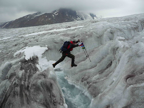 Výtah nás vystřelil za 15 sec o 108m výše a my jsme pozorovali trasu dnešního výstupu a celé okolí. Nakonec dne bylo nutno sestoupit do našeho základního tábora na Konkordiaplatzu, což nám zabralo asi 3 hodiny chůze nechutným rozbředlým terénem ukončeným řekou, kterou nakonec každý překonal po svém.