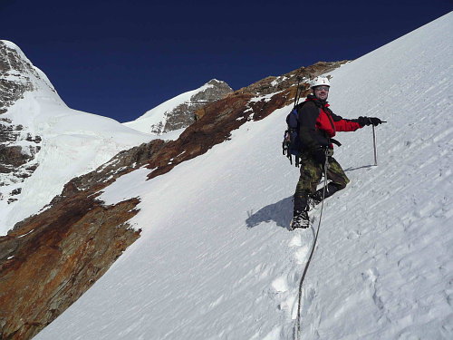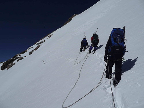 Samotný kuloár má sklon cca 40° a prošlapávat jej je docela makačka, ke konci mě střídá Bob. Sníh již začíná měknout a lepit se na mačky. Opouštíme úvodní skalisko a začínáme traverzovat pod sedlo Rottalsattel. Zde již táhne stopu Robert, který jako jediný má na mačkách vyhazovače sněhu. Pod sedlem nachází takřka zánovní trekovou hůlku. Následně stoupá asi 50m do sedla svahem o sklonu cca 50° ukončeným převějí. Je nechutné horko, praskají mi spálené rty. Ještě překonat převěj a již jsme tam.