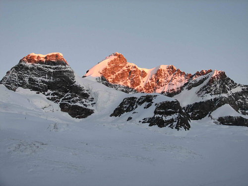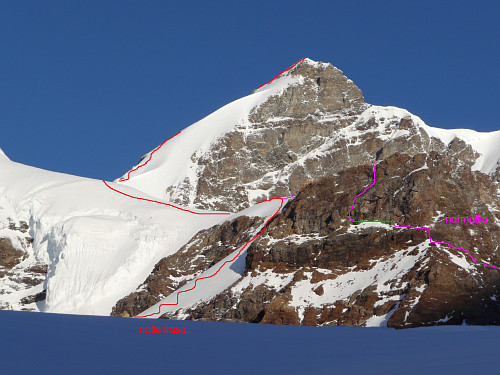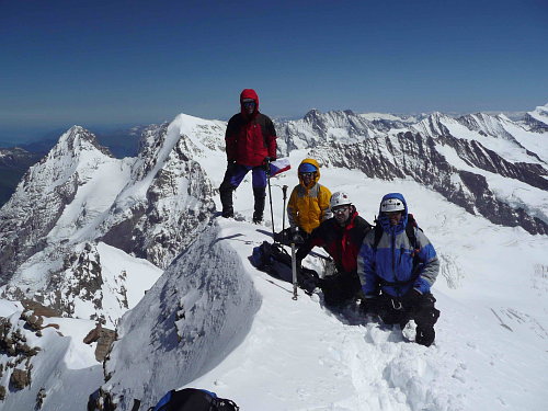 Poryvy větru mi občas chrstnou sněhový poprašek do tváře, který mi však není nepříjemný a připomíná osvěžující sprchu. Ve výšce asi 3950m kolem proletí motýl. V traverzu pod námi se objevuje čtveřice dalších odvážlivců. Trasa vede chvilku kolem vyčnívajících skal, většinou se ale bořím 20cm do prašanu. Sklon svahu je takový, že lezu po čtyřech. Levou rukou si naznačuji, kam zaseknu při dalším kroku mačku, pravou zasekávám cepín. I když mám za sebou ledacos, teprve od této chvíle si opravdu začínám říkat horolezec. Čtveřice se k nám zezadu rychle přibližuje. „To se jim to jde ve vyšlapané stopě“, houknu dolů. Pomalu se blížím ke skalám a pak již následuje jen nepříliš prudký vyfoukaný skalnatý hřebínek. Je 13:00 a již není kam stoupat. Dokázali jsme to. Panna a její ladná převějová křivka ve tvaru „S“ nás dnes k sobě pustila.