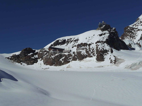 Fotíme, točíme, nádhera. Asi po půl hodince sestupujeme. Po vyšlapaných schodech to jde docela snadno. Malý zádrhel nastal při hledání správné „normálkové“ sestupové cesty a při konečném ledovém svahu u nástupu pod skalami. Vše jsme však zdárně překonali a jali se podívat do sedla Jungfraujoch na vyhlídkovou plošinu Sfinx.