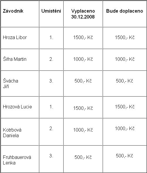 Zbývající peníze vyplatím výše uvedeným závodníkům na MČR v boulderingu, které se bude konat v Lezeckém centru smíchOFF dne 13.12.2008. Kdo se nebude moci dostavit v tomto termínu, může mi zavolat, popř. zaslat e-mail a domluvíme si osobní schůzku.