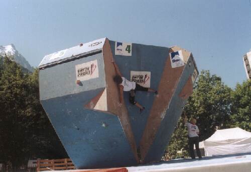 Boulderové závody pořadatelé připravili na čtyřech věžích. Na každé z nich byly tři cesty. Původně dvoudenní závod se díky nepřízni počasí scvrkl na jeden. Cesty byly postaveny tak, že na jedné věži lezli muži a ženy současně. V kvalifikaci si lezci museli poradit s pěti bouldry během pěti minut a ve finále se lezlo šest boulderů do šesti minut. Kvalifikační cesty byly super těžké a tak TOP dal málokdo. České želízko v ohni Jiří PŘIBIL na čtvrtém boulderu se nedokázal rozkročit jako ostatní (zkrácené přitahovače), řešil boulder po svém a byl z toho jediný TOP na této cestě. A tak se stalo, že byl zbytkem výpravy prohlášen za Mistra Evropy v koutovém lezení.