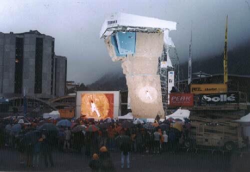 Snaha organizátorů vyhnout se dešti vyšla naplano až ve finále. Start v půl deváté večer byl provázen již několika hodinovým deštěm. Diváci se snažili schovat za deštníky a výřečný moderátor udržoval náladu ve varu. Místní frantíci pořvávali ŠABÓ, ŠABÓ (Chabot). Pak to přišlo. První na řadu šel vítěz letošních světových pohárů Alexandre CHABOT. Jeho odhodlanost a skvělý styl vyvolávaly v publiku euforii. Po překonání dvou převisů následoval těsně pod vrcholem skok obouruč do chytu. CHABOT skočil a dal TOP. Pak do cesty nastupovali další lezci zvučných jmen, ale nikdo nedokázal přelézt druhý převis. Francois LEGRAND uklouzl po stále vlhnoucí stěně a byl pomalu nepříčetný. Vše čekalo až na posledního - Tomáše MRÁZKA. Ten nic neřešil a lezl. První převis přelezl obráceně nohama než ostatní a valil dál. Postavil se nad druhý převis, ale tam vlhké chyty zdolaly i jeho. Takže druhé místo.
