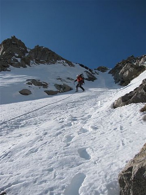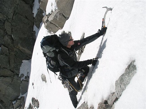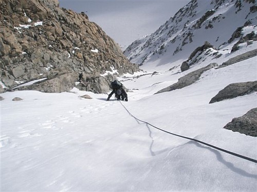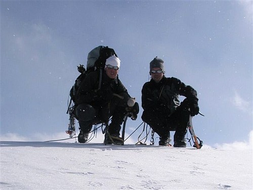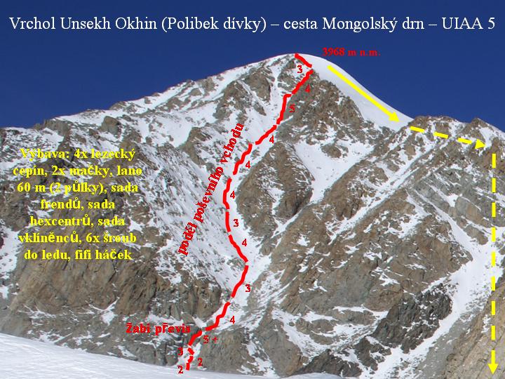 Hned druhý den ráno jsme se Standou vyrazili na první prvovýstup. Vybrali jsme si kopec s názvem Unsekh okhin (Polibek dívky) cestou již námi pojmenovanou jako Mongolský drn obtížnosti 5 UIAA, která vedla regulérně zleva kolem poševního vchodu (posuďte sami na fotce). Bylo to takové kombinované lezení, chvíli sníh, chvíli led, taky trocha ne moc pevné skály, celkem o 15 délkách, kde jsme se poctivě střídali, jištění jak to šlo (občas jo, pak zas ne) a tak jsme za poměrně zhoršeného počasí stanuli společně i s Panem Opičákem po 5 hod lezení na vrcholu. Nádhera, ten pocit je prostě nepopsatelný, každý dosažený vrchol je poezie sama o sobě. Dolů jsme nejdříve trochu popojeli malou lavinkou a pak sjížděli po botách (jen tři pády) zamrzlým vedlejším žlabem s postupným rádoby jištěním. Krásný výlet jsme večer oslavili slivovicí a Kapinka (místní pes) dostala poprvé nažrat (pár kousků kolínek a chleba).