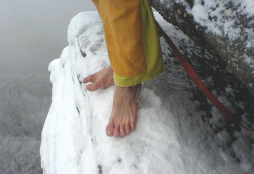 Stojím na nástupu- tý krve zas tolik není. Zouvám boty a doufám, že se nikam nezakutálej. Jejda jedna se skutálela. Nastupuju. Opatrně se stavím a vydávám se na druhou. Pěkně pomalu, aby námraza stačila pod chodidlama rozmrznout. Ke konci se jí rozmrzat už moc nechce a ani se nedivím. Rampouchem rampouch nerozmrazíš! Konec.