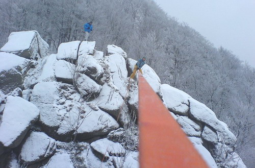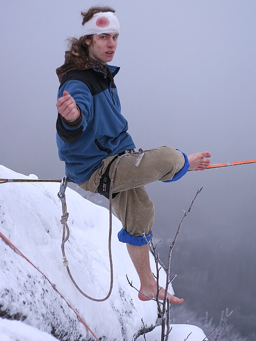 Jako první, na poměrně dost namrzlou lajnu, nastoupil Smolda. Dal dva pokusy, dvakrát lapil a šel se ohřát.  Po něm si vzal slovo Kwjět. Ten ovšem, na rozdíl od Smoldy nazul botky hajlajnovky a rukavice na snoubord. V důsledku čehož po nástupu nejprve za a/ uklouzl... a za b/ nelapil! No a jelikož to bylo na nástupu, tak po celkem slušným pendlu narazil čelem do "hrubozrný Jizerský žuly". To mělo za následek to, že začal ztrácet barvu ( sníh kolem naopak barvu získávat začal).