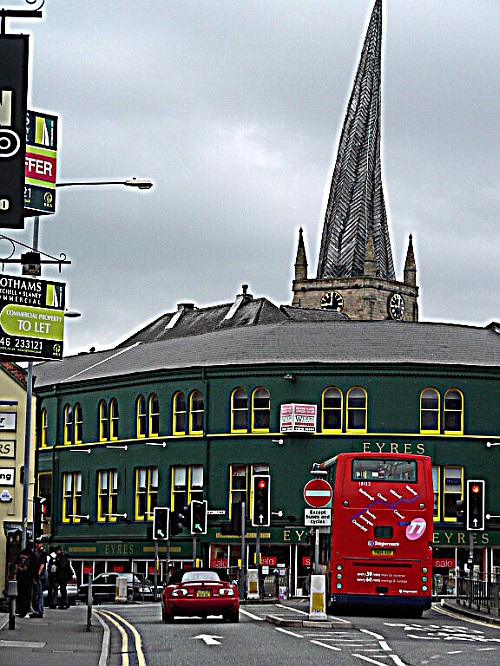 Mávám  a stává se zázrak.  Hned první auto mi staví a veze mě přímo do Chesterfieldu! Aha, tak takto si stop z minulých dob nepamatuji. Tak hurá proběhnout s 15kg batohem historické centrum kolem věže která se co nevidět skácí. Nemám čas na řádné focení, nějací dva pobudové se za mnou soustavně plíží  a mumlají něco o five quid. Asi chtějí pět chobotnic. Kde bych je jako měl sebrat?