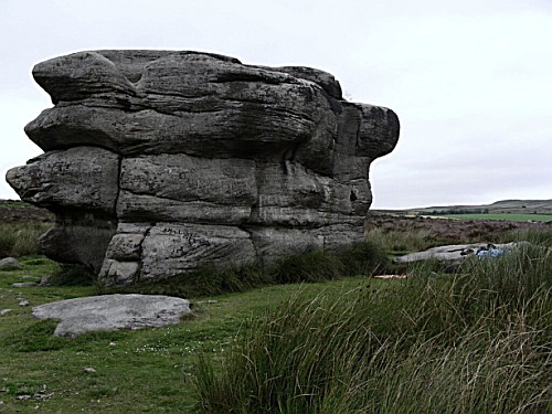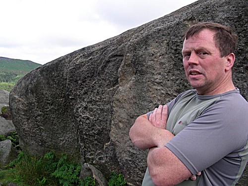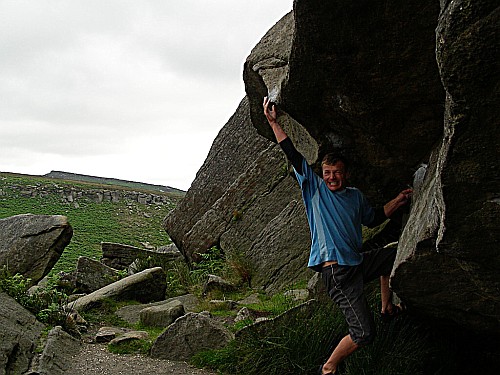 Padá se do měkké trávy a ovčích hoven, takže jsem rád že těžká a ne až tak potřebná bouldrmatka zůstala doma. Matroš tu mají hrubozrnný, příjemný na omak i když občas hrubší krystalek zabolí. Ale bouldry na Eagle Stone jsou na mě moc lehké nebo moc těžké. Tak mastím dále. Jenže to dohledávání bouldrů někde ve svazích, troche kape, celkově vlhko a docela zima . Průvodce nerozlišuje pěkné a bezvýznamné bouldry. Hlavně ty ve Frogattu jsou hnusné. A kde bez stanu budu spát? To měl Pušer, který sem podniknul podobný výlet za bouldry někdy před lety, ten měl plnou hubu keců  jak že je všude spousta převisů na spaní a já přitom za několik hodin neviděl ani jeden! Tedy  no já nevím, užívám si to, ale neměl jsem  jet radši s Tomajdou do Ádru? Ne ne, oklepat ze sebe sebelítost a vzhůru k dalším dobrodružstvím! Mapa mluví jasně, hřeben Peak Districtu osázený bouldry  se táhne asi 20 km daleko. Nějaký lezení a spaní se snad najde. Na šutru The hairpin boulder se slušně vyřádím. Kromě toho pracuju s nezvyklými pocity samoty.