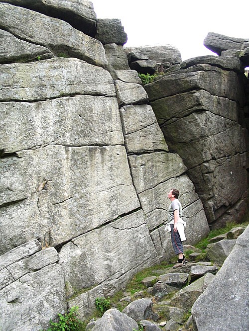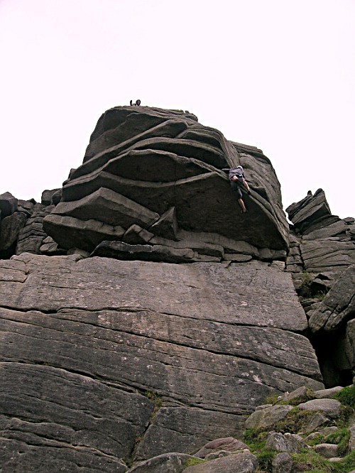 Vichřice, což je tady na hřebenu Stanage taková normální rychlost větru odfoukne vše co vedle sebe volně položím .  Jako třeba jídlo nebo brejle. Po chvíli slyším jak někdo ke mě zespoda leze , nenechám se prvolezcem očumovat a jdu se ještě na večer namlsat pohledem na slavné bouldry, jako třeba Deliverance nebo The green traverse. Ochutnám je oba zítra.