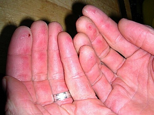 Je tu na dovolené jako já s tím rozdílem že on bydlí jen 10km odsud. Začínal tu s lezením před asi 20ti lety, vymlátil si kolena vysokými odskoky, protože dříve bouldrmatky nebyly. Pak postavil dům, udělal rodinu a teď se s maxi pupíkem vrací k lezení. Ale už s bouldermatkou. Celý den bouldrujeme a on mi nadšeně vypráví co si tady mezi těmito šutry zažil. Třeba jak podcenil dolez 8 až 9m vysoké cesty co lezl solo a zřítil se z vrcholu. Fotka zkresluje, ten pád musel mít opravdu až nějakých devět metrů..