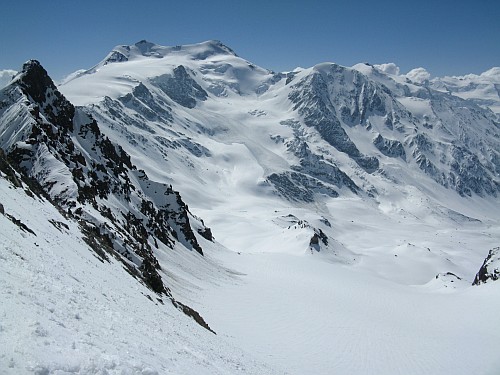 Monte Cevedale (3769 m), jako by nebyl v Ortleru. Je tamější skitouringovou Mekkou, skutečně se lze většinou dostat na lyžích až na vrchol. Za pěkného počasí na něj míří ze všech stran zástupy skialpinistů. Výstup od Rif. Pizzini je trasa nejkratší a s nejmenším převýšením (1069 m), přitom ne tolik „zacpanou“. Nejdříve se jede severovýchodně k materiálové lanovce Rif. Casati, poté se pokračuje jihovýchodně mezi stěnami a markantní skálou Le Guglie na ledovec Vedretta di Cedec. Dvě jeho ploché části střídá jeden strmější výšvih, kde jsme ocenili haršajzny. Zhruba ve výšce 3300 m je nutné zdolat strmý přechod na ledovec Zufallferner (Vedretta del Cevedale), kde jsme museli dát pozor pod okrajovými séráky. Sem je nezbytné být obezřetný, držet se dále od skal. Tento prostor bývá lavinézní. Na platu ledovce jsme se napojili na trasu od chaty Casati. Při nepříznivých podmínkách je skidepot na úpatí hory. Zde pozor na okrajovou trhlinu. Trhliny jsou také ve výstupovém severozápadním svahu, přičemž stopa bývá již časně dopoledne rozježděná. Výstup je však zřejmý a lehký, v sedle mezi M. Cevedale a Zufallspitze (Cima Cevedale) vpravo jihozápadně po širokém firnovém hřebenu. Návrat na chatu je stejnou trasou.