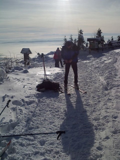 Je sobota půl osmé a vyrážíme z Papežova. Podmínky jsou skoro ideální, je jasno, teplota -5, v noci nasnežilo pár centimetrů snížku. Běžkař jde tradičně cestou, já uhýbám po několika metrech doprava do lesa. Jdu sám a tak nemám žádnou představu o tom, jestli zvolené tempo je pomalé nebo rychlé. Mně se zkrátka jde dobře. Přesně za hodinu jsem na Zimném a tempo se mi zdá pomalé. Zrychlovat ale nebudu, protože mám ještě mnoho metrů stoupání před sebou a upřímně řečeno, ani mi to nejde. Pod sjezdovkou koukám doleva na cestu a vidím "svého" běžkaře. A to jsem si myslel, že na mne již půl hodiny čeká v Šantánu. Na kole mu cesta na vrchol Lysé trvá 50 minut. No, ale zima je zima.