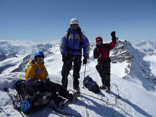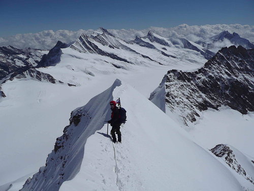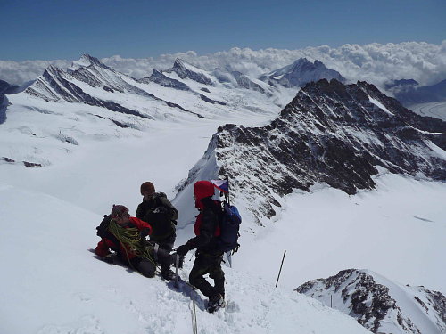 Jakákoliv chyba by mohla být tou poslední. Jsme tady. Vrchol Möncha je docela prostorný. Pod námi je moře mraků. Pod horami v údolí Grindelwaldu si asi počasí moc nepochvalují. Nám je ale krásně, i když trochu zima, protože dosti fouká.