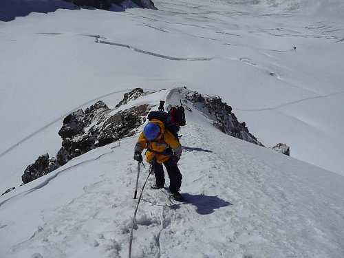 Tento terén mi na rozdíl od Roberta vyhovuje a proto ho co chvíli dobírám u tyčí. U poslední tyče nás čeká pohled na závěrečný super ostrý hřebínek, který si žádá odvahu a jistotu chůze. Pomalu ale jistě postupujeme po dobře promrzlých převějích k vrcholu. Občas docela fouká a proto všemu velí nejvyšší opatrnost.