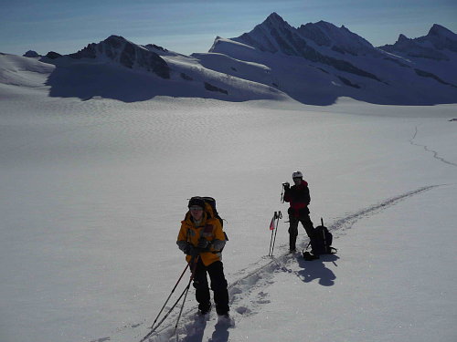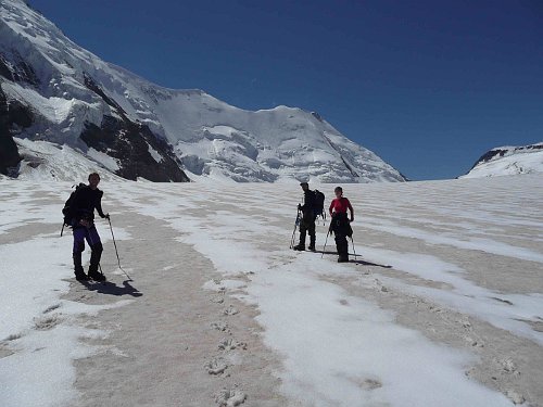 Další den volíme jako odpočinkový. Kolem 11 hodiny vyrážíme po ledovci Grosser Aletschfirn k chatě Hollandiahütte, vzdušnou čarou cca 7,5 km.