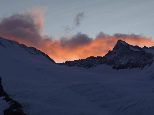 Celou noc jemně prší. Je středa 20.8 4h ráno a bolí mě hlava. Po nebi se honí mraky, občas se prodere měsíc. Nastupujeme do želez, vážeme se na lano a já začínám hledat cestu královstvím ledopádu. Vcelku bez problému postupujeme při jeho pravém okraji ke skalnímu prahu, kde začíná téměř nekonečná pláň ledovce Enigschneefäld. Nebe se vyjasňuje a každým okamžikem očekáváme východ slunce.