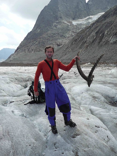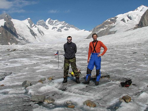 Další den dopoledne balíme. Všichni, až na Boba, už toho mají dost a tak velíme k ústupu po ledovci Grosser Aletschsgletcher k jezeru Märjelesee. Po složení stanu se ukazuje, jak rychle ledovec mizí. Tam, kde stál náš stan, led netál a zůstala tam plošina asi 5 cm nad úrovní ostatního ledovce. Za čtyři dny slušná práce. Před sto lety bychom byli asi o 100m výše a k chatě Konkordii bychom asi doskákali přes pár kamenů.
