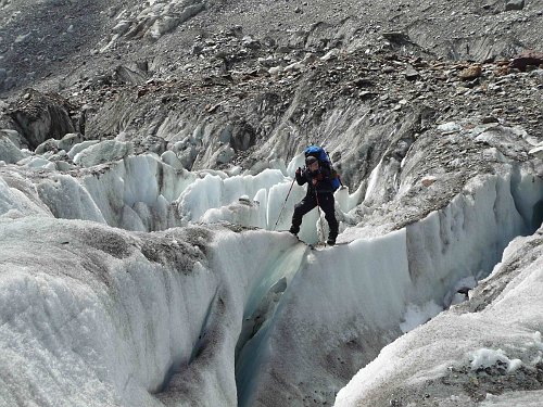 Loučíme se s BC a s krysami na zádech neméně těžkými, než jsme sem přišli, se vydáváme po ledovci dolů. Asi po kilometru se objevují trhliny, které se s přibývajícími metry stávají stále hůře překonatelnými. Nakonec jsme se dostali do stádia bloudění zleva doprava, až jsme se navzájem ztratili.