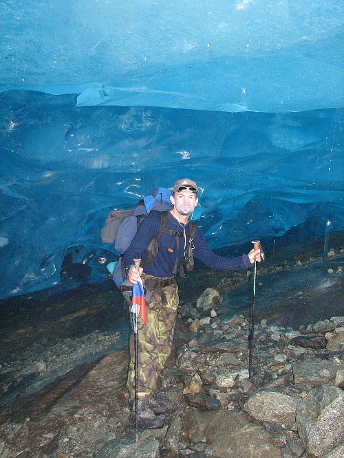 Asi 100m přede mnou se po chvíli objevilo několik postav, to ale nemohli být mí parťáci. Každopádně jsem se k nim mně neznámým způsobem dostal. Sdělení, že dál již je cesta „very easy“ mě trochu uklidnila a totální jistotu mi dodala SMS od kolegů „ jsme v pořádku, jdeme po pravém kraji ledovce, sejdeme se u rozcestí“. Což se do puntíku splnilo a mezi posledními velkými trhlinami jsme prošli k jednomu z úpatí ledovce. Focení v ledovcové azurové jeskyni ukončilo naši misi po ledu, což jsme po většinou kvitovali.