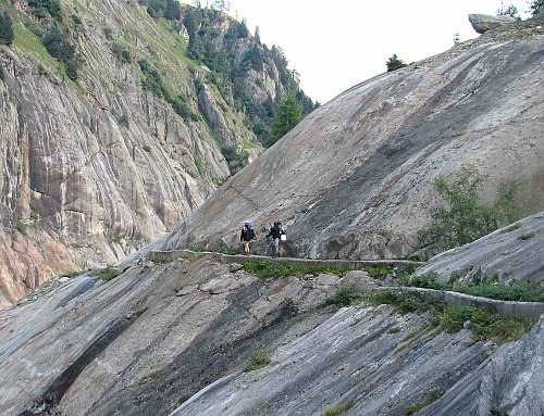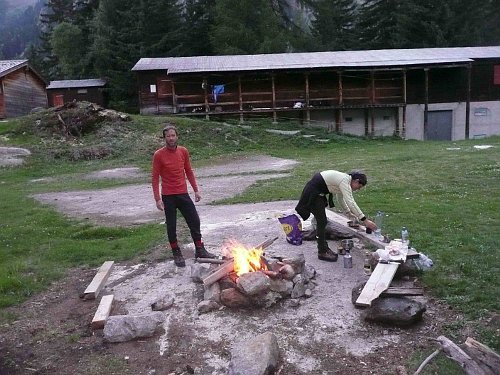 Pod ochozovými stříškami jsme si ustlali a  u ohníčku usušili boty. Pěkné místo. Ráno jsme sestoupili do Fiesche až do kempu „z´moosji-eggishorn“ kam jsme dorazili asi v 11 hodin.