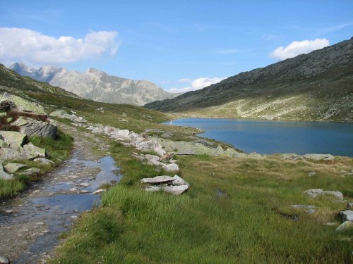 Sestup ze sedla byl zpočátku dost prudký a začalo být dost vedro. Zvolili jsme variantu přes chatu Burghütte (1800m.) kam vedla výborná „pašerácká“ stezka zajištěná občas lany a skobami. Pod chatou jsme nastoupili do vybetonované stezičky kolem skal, kudy zřejmě vedla dříve značená stezka. Po chvíli se stezka setkala s oficiální a ta nás dovedla do horolezeckého tábora Titter, který se ukázal jako cílový pro dnešní den.