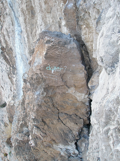 Via Onanator 7b/c 100 m, 5 délek: 6b, 6a, 7b/c, 7a, 6b, S1/I, F. Gerwald, C. Danker 2003