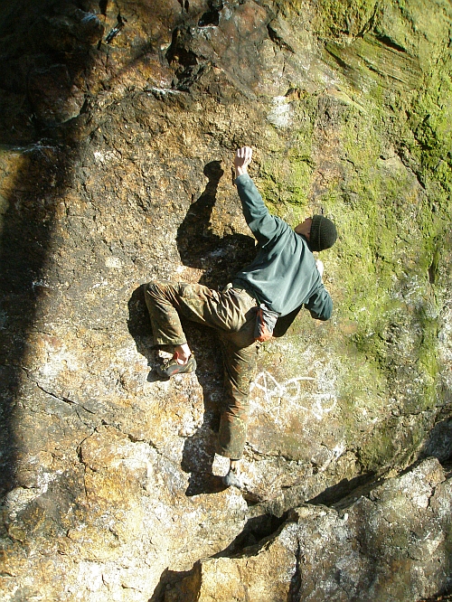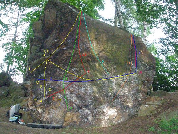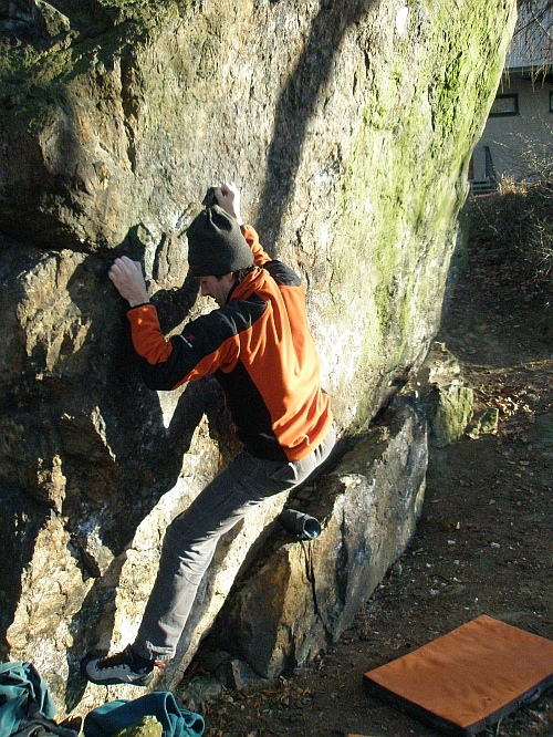 2. Nejlepší je skotská 6C nástup z lišt u levé hrany (bez kamenů vlevo), traverz doprava až do nástupového madla bouldru Griotka je svině a tím nahoru, jen po chytech nad patestem