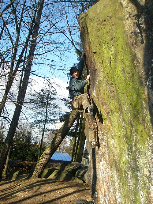 Když jsme s Hopákem před pár lety hledali nové bouldrové možnosti kolem Plzně, objeli jsme kdejaký buližníkový kvak a doufali, že nalezenem alespoň něco podobného Hříbku na Radyni. Co jsme našli, nemusím psát. Je to na 5 písmen a začíná na h, jo, ještě pár hub na smaženici. Nedávno jsme jeli na kole přes Kyšice v rámci horobike vyjížďky a kousek od nás jsme v parčíku nad hřištěm pro národní házenou viděli malou skalku. Nebyl čas se na ní jet podívat, ale někdo prohlásil: „To by byla prdel, kdyby tam byl nejtěžší boulder na světě a jezdili sem na to lezci.“ Pak jsme v Kyšicích dělali střechu a došli se na ten šutr podívat. Ne že by tu šel udělat nejtěžší boulder na světě, ale byli jsme velmi příjemně překvapeni, protože to bylo přesně ono, co jsme s Hopem hledali po lesích několik let.