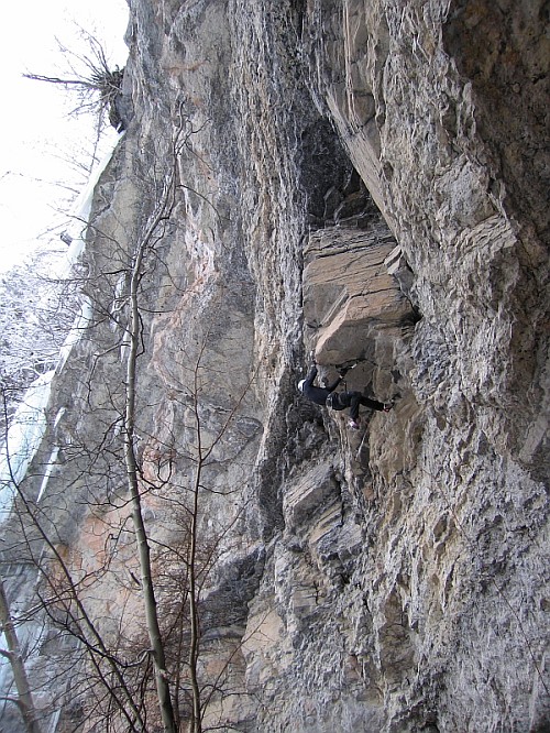 Jištění je velice slabé a lezec neustále leze na hranici patnáctimetrového pádu jestliže jištění vydrží.