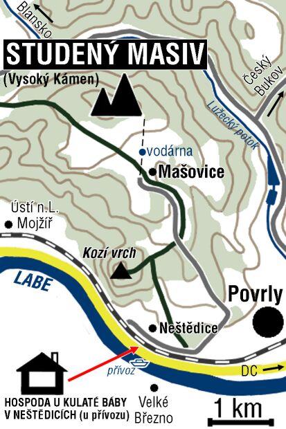 Kudy tam: autem z Ústí po levém břehu Labe směrem na Děčín, vyjedete z města, minete po levé ruce skalnatý Kozí vrch a za ním z hlavní silnice zamíříte do prvního podjezdu pod trať na Neštědice a Mašovice. Neštědicemi pojedete asi půl kilometru až k odbočce, která míří doleva, zhurta do kopce a na Mašovice. Nenechte se zmást značkou slepá ulice, silnice je skutečně slepá, ale až po dvou kilometrech stoupání. Zkrátka po ní dojedete do Mašovic, což jsou dvě čísla a nic, asfaltka skončí a po polní cestě dojedete ke staré vodárně, sousedící s jakýmsi vysílačem. Tam necháte káru, dáte se po spádnici před louku a les do sedla, z něho doleva 100 metrů k východní patě Studeného masivu.