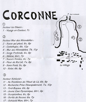 Vydali jsme se nad malebnou vesničku Corconne na průzkum, vytištěný list se seznamem v ruce a pevnou vírou postupem podél stěn nebylo možné identifikovat sektor, ve kterém jsou udělány cesty. Namířil jsem si to tedy k té nejpěknější stěně, tam rozhodně nějaké lezení musí být. - Nebylo.