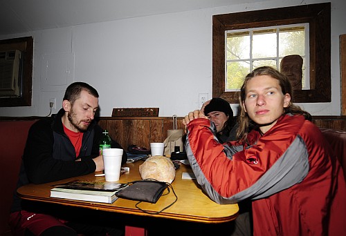 Kapitolou samou pro sebe byla Miguelova pizzerie. Ze strany od silnice, mimochodem docela rušné, nevelká žlutě natřená prkenná stavba s vývěsním štítem ve tvaru Miguelova emblému. Lavice před ní, sedačky ze školního autobusu uvnitř. Interiér vůbec budil úžasný dojem. Nic tam nebylo nové. Spíše neuvěřitelně ošuntělé, ale jakýmsi zázrakem útulné a příjemné. A hlavně veskrze lezecké. Nad pultem, u něhož se z fronty objednávalo jídlo a pití, a pod celým stropem lokálu visí nejrůznější lezecký materiál. Doplňují jej stojany mezi stoly a při vstupu na záchod (vidíte, na ten jsem zapomněl, takže jsou tam vlastně dva záchody). Prostor totiž současně funguje jako outdorová prodejna. Po stolech se povalují lezecké časopisy a knihy. Od října včetně té naší o Sasku. Od brzkého rána do pozdního večera je tu plno, ale vládne tu pohoda a všechno odsejpá. Systém objednávek je geniálně jednoduchý. Gró nabídky tvoří pizza, omeleta, muffiny, půllitrové kelímky s čajem, kafem nebo horkou čokoládou a zázvorová limonáda Ale-8-one ve skle. Pizzu a omeletu si objednáte tak, že vyplníte formulář, kde zaškrtnete přísady, které na pizzu nebo do omelety chcete, doplníte své jméno, odevzdáte jej u pokladny a jdete se posadit kamkoliv. Všechno vám přinesou, lhostejno, zda sedíte uvnitř nebo venku. Ještě teď mi v uších zní volání obsluhy, částečně složené z příslušníků Miguelovy rodiny a částečně z lezců-brigádníků. Protože zákazníci čekali na svou pizzu i v samotném kempu, stále se ozývalo „James!“ nebo „Michael!“ a tak podobně, dokud se nenašel ten správný hladovec. Konkrétně mě volali „Džarda!“. Přestalo to v okamžiku, kdy jsem na lístek místo Jarda začal psát Yarda.