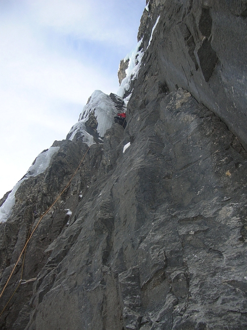 Před námi je poslední den lezení a tak plánujeme co dál. Cítíme únavu z předešlých dnů a jsme vyčerpání jak fyzicky tak psychicky. Ovšem euforie z přelezených cest je znát. Nejsme si jisti jestli už si nemáme jen užít poslední den příjemným ležením nebo se opět pěkně vybát. Nakonec se rozhodujeme pro další těžkou cestu. Naživá se The Real Big Drip, V M7+ WI7. Celý večer se dohadujeme co to může být WI7. Převislé? Bez pořádného jištění? Nebo co vlastně? No necháme se překvapit. Další den dorazíme pod stěnu a říkáme si: to není WI7!!! První délka má být M7+ s patnácti bolty plus 15m WI6+ ledu. Daří se nám tuto délku přelézt celkem rychle. Druhá délka led ze WI6.
