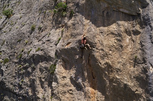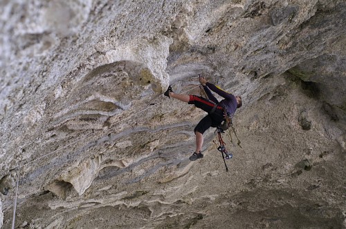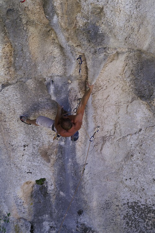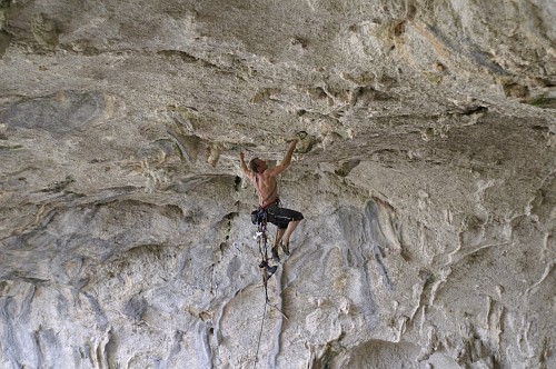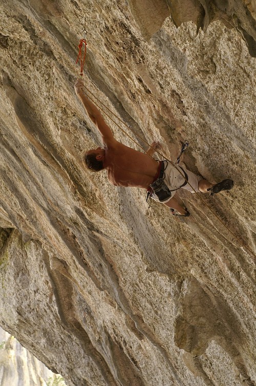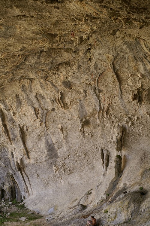 Už o vánocích jsme si vyhlídli směr na stěně vedle jeskyně , kde byla volná parádní 33m dlouhá linie s převislostí asi 15m a která se zdála lezitelná, ale konečně to šlo i seshora. Padlo tam 17nýtů a opět tam vznikly 2 obtížnostně rozlišné cesty. První za 8a s názvem Warm Up a druhá, podle mě těžší než Illy - tak jsme klasifikaci ani nenavrhovali a uvidíme:), s názvem Tactoo.