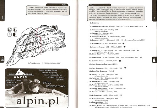 Průvodce jsme pořídili na shronisku za 13 éček, jinak chtěla slečna 45 zlotek. Ještě tam mají nějakou polskou učebnici lezení asi za 35zl (nejspíš Planowanie treningu we wspinaczce sportowej od stejného nakladatelství) a průvodce na nedaleké Rudawy Janowickie za 35zl. Tentokrát jsem nejprve mluvil suše česky a slečna odpovídala suše polsky - že bere jen zlotky a že se domluvíme cestou zpátky. Ani večer na mě neměla náladu, ale naštěstí jsem opatřil éčka u lezců tuším z Vysočiny a pak jsem se až do rána objímal s komárama a muchničkama na louce. Při další návštěvě jsem slečnu obral éčkama o dva průvodčíky. Jen do teď nechápu, že se za každý průvodce platí úplně v jinym kurzu měny. Asi jsem dostal nějakou turistickou přirážku na podporu regionu. Na to, že tam leze polovina Čechů by mohli trošku polsky obchodně myslet a ty kačky používat.