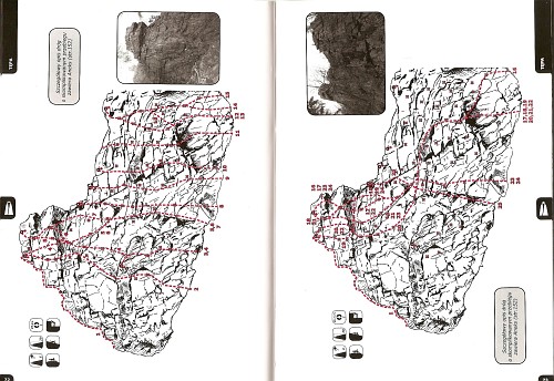 U každé věže je v průvodci popis, malá fotka odpovídající nákresu, nákres, piktogramy a seznam cest (s obtížností, autory, někdy popisem cesty). Ta malá fotka je boží, protože podle ní zorientujete bezvadně nákres - muselo to dát dost práce sfotit. Nákresy stran věží jsou černobílé s červenými tlustými čárkovanými linkami cest. Piktogramy u věží označují světovou orientaci, výšku skály, rozložení obtížnosti min-max a sklon cest. U obtížnosti cest je někdy v závorce TRAD / TRAD+ to jsou cesty s vlastním jištěním (popř. slaňákem), plusko znamená přibrat k tradiční sadě frendů 1-5, karabin a smyc také navíc: speciální vklíněnce, další frendy nebo minifrendy.