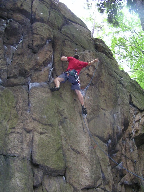 Také o minulém víkendu stále ještě pršelo, takže jsme využili nabídky Trutnovských lezců a nechali se doprovodit ze Žacléře do Polska. Investice do paliva se vyplatila a poznali jsme nové skály, kde je slyšet polské i české lezecké povely a nadávky. Lezců je tam mraky, nebo jsme trefili nejnavštěvovanější věže. Zase to mělo výhodu, že jsme si mohli vybrat, které lezkyně a nadějné adeptky máme obdivovat. Taky tam trénoval borec slacklineista takovou jednu high asi 30metrů dlouhou, viděli jsme pády a ručkování, ale i úspěšný radostný přechod tam a nakonec i zpátky.