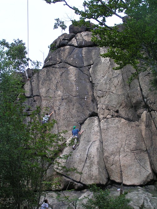 Asi se hodí i malý popis skal, ale článek o lezení na Sokolíkách by měl napsat někdo, kdo se tam vyzná víc. Takže k zajímavým věžím se dostanete od schroniska dál na vrchol kopce, dolů a opět nahoru na druhý kopec, stále širokou cestou. Jsme ještě v Karkonoskem parku narodowym. Žula je zde jemnozrnná, žádných velikých krystalů jsem si nevšiml. Na tření to drží a k tomu uživíte krom lezeček i ruce, něco je třeba protlačit. Většinou jsou to takové jakoby balvanovité hromady, takže krom rajbasů, spár a oblin zakusíte i převisy, silové sokoly, najdou se madla, dírky, škrabky a stiskáče, poličky a sem tam lišta. Někde může po deštích protékat i voda. Sportovky jsou osazené borháky nebo nýty cca po 3 metrech a některé nákresy mají křížky. Bouldery jsou tam také. Slanění na skále tvoří bytelný štand - zavrtaná a zalepená sada, která je svařená už od výrobce - 2 borháky spojené dvěma oválnými oky řetězu, na spodním borháku jsou dva kruhy, všechno ve stříbrném nerezu (žádné mailony, leda že by to snad časem někdo přebrousil TR). Ale najdou se i komplet tradiční věže, kde není kouska železa. Jediný problém je moc cest u slaňáků (ve kterých je jako i jinde povoleno jistit pouze přes vlastní karabinu nebo 2 expresky!), to může být v tak hustě lezené oblasti problém. Navíc pokud tam mají ve zvyku lézt s horním a obsazovat cesty nebo i celý slaňáky.