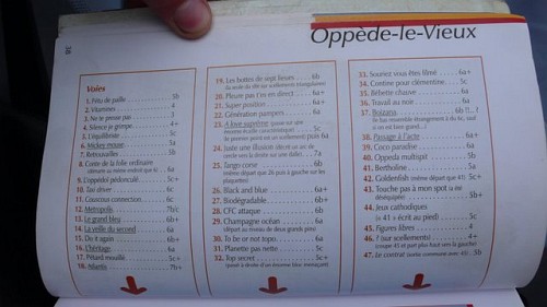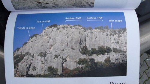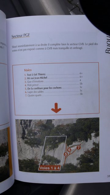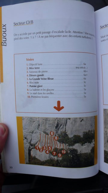 V Buoux jsme volili sektory s nejlehčími cestami, protože jsme netušili, jaká je francouzská stupnice a co budeme schopní v dané obtížnosti vylézt. Naše cesta tedy směřovala do sektorů PGF a GVB. Je tu spousta krásných cest do 5c (6UIAA) včetně.  Mně osobně se moc líbila  De la confiture pour les cochons (5c) a Lapin des sables (5c). Přelezli jsme téměř všechny, pro představu přímo průvodce:
