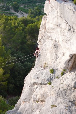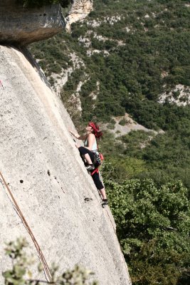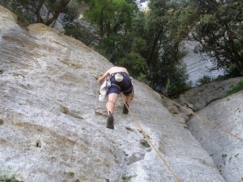Lezení: Odbila čtvrtá odpolední a na skále Francouz vedle Francouze, vypadalo to tu skoro jak na Rovišti. My jsme zase vybírali lehké cesty, nejvíc času jsme trávili v Château, kde najdete jak lehké cesty, tak i krásné převisy nad 6b. Je to tu lehce oklouzané, hlavně čtyřky, 5b a 5c relativně šly. Cesty jsou docela dlouhé - vyklapala jsem cestou i 15 expresek - některé vícedélkové, i z těch jednodélkových je třeba občas se 60m lanem slanit na dvakrát, hodně lidí tu lezlo s půlkami. Lezli jsme v Château v podsektorech Anticlinal a Racines du ciel. Na Anticlinalu byly v některých 5c docela poctivé šestkové kroky, ale vesměs byla cesta „dokopečka“, což je u 5c po madlech. Poslední den jsme zavítali na Quiquillon (čti kikijon), vyzkoušet vícedélky, které nám doporučila skupinka mladých Francouzů. V podsektoru Ramier na Quiquillonu je moc hezká cesta Brazil.